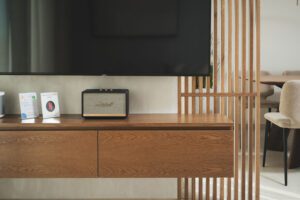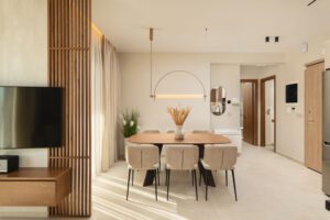 Two bedrooms with king size beds (upon request one king size bed can be made into 2 single beds) and a sofa bed in the living room that can comfortably accommodate up to 5 people.