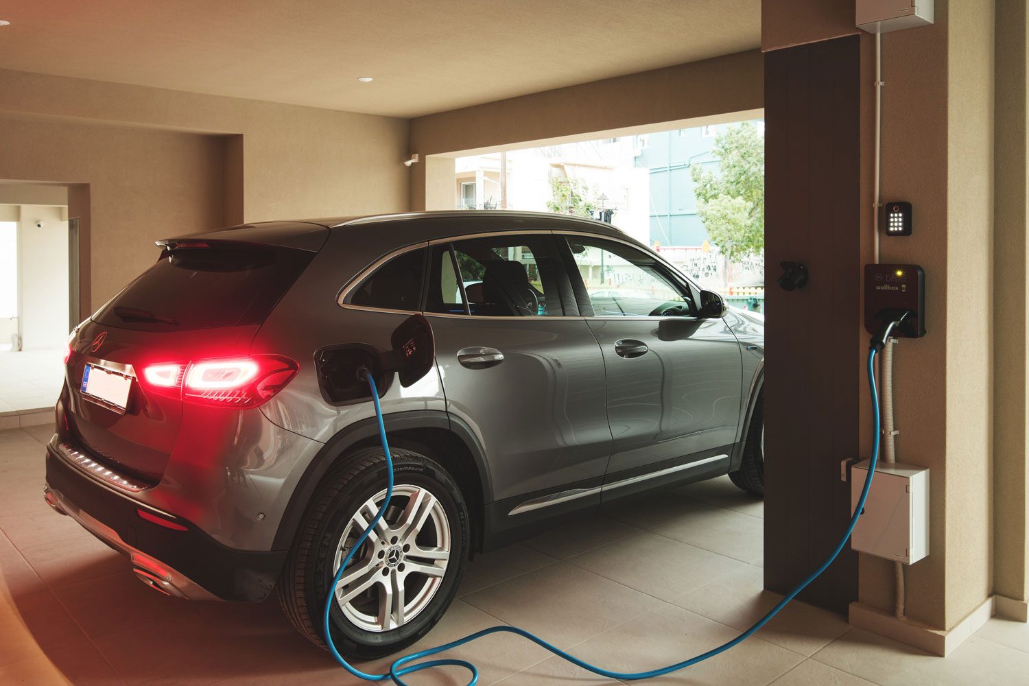 A car charger has been installed in the flats of the apartment building to serve the needs of an electric or hybrid vehicle.